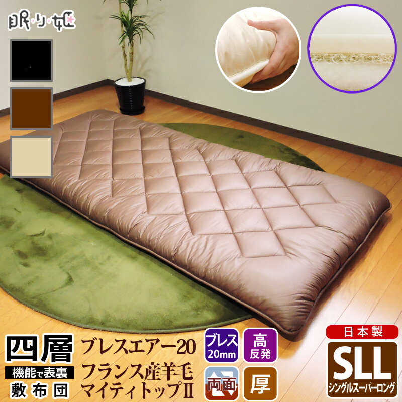 敷き布団 四層 シングルスーパーロング 羊毛混 ブレスエアー(R) シンプルカラー ポリエステル 高反発 オールシーズン 体圧分散 腰痛軽減 蒸れにくい ブラウン ロング 長身 長め ふとん 日本製 眠り姫 寝具 敷布団 送料無料 ようもう ぶとん マット 中材 クッション ベビー